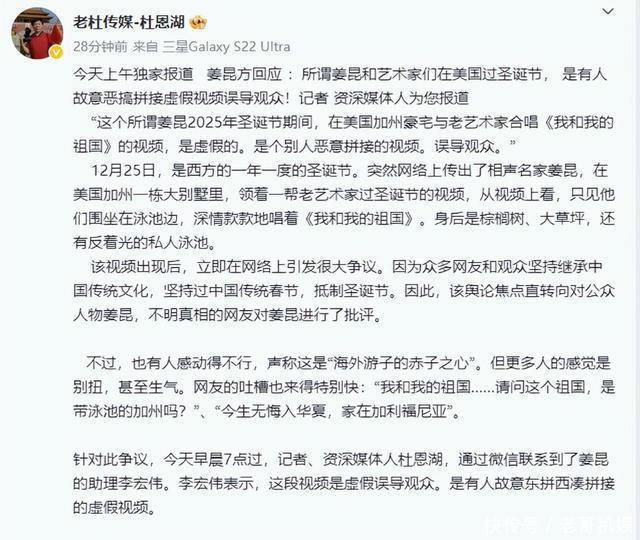 镜头之外,流量开始变得热闹起来,情绪开始不受控制,各种帽子到处乱飞。而后姜昆在美国过圣诞的事情被快速加工,随后进行二次传播,最终演变成了某种道德审判的情况。直到12月26日,人们才发现这出戏存在问题。 媒体从业者杜恩湖与姜昆一方取得了联系。姜昆的助理李宏伟对此事做出了回应。李宏伟的回应十分直接,他表示相关视频是经过拼接而成的,视频内容存在明显的误导性情况,并且姜昆本人一直都在国内,同时姜昆正在进行新节目的录制工作。